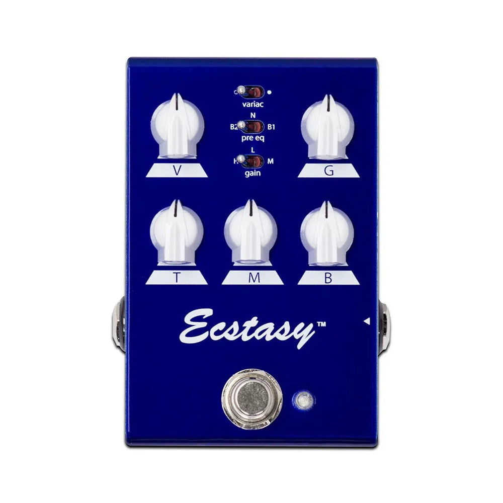 Reinhold continued to stay true to the Ecstasy amplifier’s blue channel with the pedal’s EQ and control layout. The 3-band EQ is voiced to precisely represent the amp, with mini toggles for variac, pre eq, and gain that define the pedal’s overall tonal character, allowing you to go from crystal clear tonal enhancer to raw, overdriven rock tones. What differs in this mini pedal is that the 3-band EQ is active with a sweepable mid frequency vs the original pedal which has a passive EQ.
