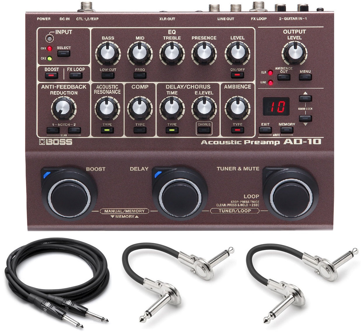 Anyone who plays an amplified acoustic guitar on stage knows what a challenge it is to get a sound that’s as inspiring as playing the instrument acoustically. The AD-10 is your solution to this age-old problem, offering advanced sound tools that enable you to achieve rich, natural acoustic tones every time you perform. At its core, the AD-10 is a fully featured, dual-channel acoustic preamp/DI pedal with premium audio quality, deep sound-shaping options, and flexible connectivity. On top of that, ambience, chorus, and delay effects are built in, eliminating the need to carry external sound processing.