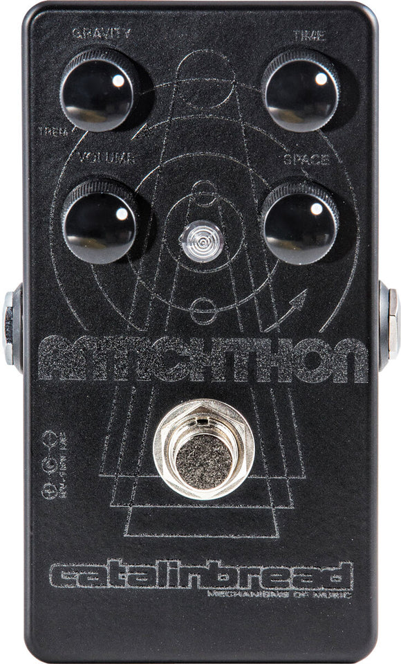 Welcome to the Catalinbread Antichthon, where nothing behaves as you expect it to. Where your guitar’s volume knob suddenly becomes a way to dial in strange new vistas of sound. Where your guitar’s volume knob makes things speed up or slow down, as your guitar pulsates like some strange new quasar. Where huge chords, laden with harmonics, give way to undulating tremblings.