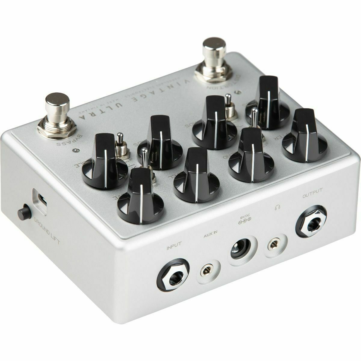 The upgraded Vintage Ultra v2 features all the versatility and sonic possibilities of the first version plus: (1) Single user loadable cabinet simulation impulse response. (2) Micro-USB B port to connect to PC/Mac to load a different Virtual Cabinet through the Darkglass Suite. (3) 3.5mm headphone output with cabinet simulation. (4) Balanced XLR output with switchable cabinet simulation.