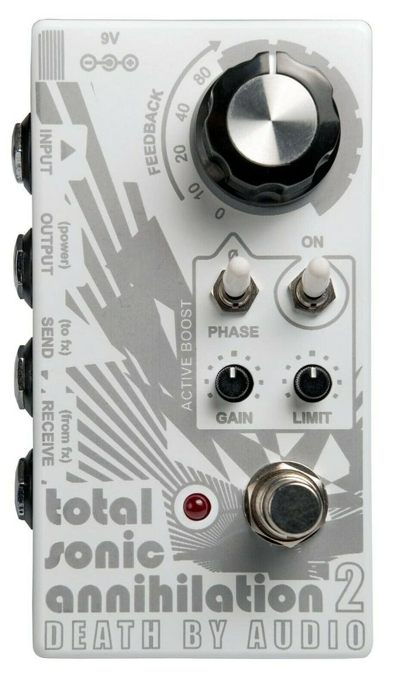 If you've used a feedback loop pedal before, (like the 1st edition of the Total Sonic Annihilation) then you know the vast world of insane and wild sounds you can get. With this new updated version of the original, the ACTIVE BOOST maximizes usability for many applications where the original fell short. For example, if the effect in the feedback loop is out of phase with itself, the loop would turn the pedal into a volume or blend pedal and be somewhat disappointing. With the TSA2, just flip the PHASE switch and all of a sudden those once dormant possibilities are awakened! The BOOST also has a boatload of gain to awaken even the faintest effect into an unearthly behemoth, and a LIMITER to tame the most unruly beast into a purring kitten. Experiment with as many different pedals in the FEEDBACK loop for unique and incredible results!