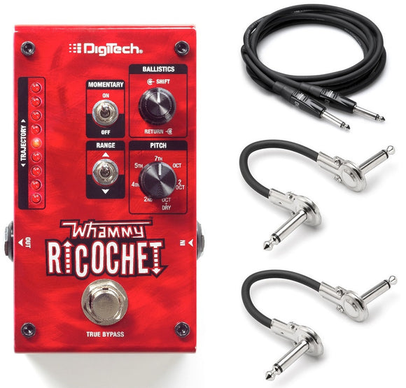 The Whammy Ricochet lets you bounce your playing up or down in pitch in controlled or crazy shifts. A momentary switch and customizable independent rise and fall time ballistics, allow you to get the Whammy action you know and love without the use of a treadle. Just hold your foot on the footswitch and let the Ricochet do the rest. Seven pitch selections: 2nd, 4th, 5th, 7th, Octave, Double Octave, and Octave+Dry, as well as a toggle to select up or down for the selected pitch. The Whammy Ricochet also has latching footswitch mode so you can rise or fall to pitch and stay there, and an LED ladder that shows your shift trajectory at all times. All these controls combine to create classic Whammy pitch-shifting as well as new sounds never heard before.