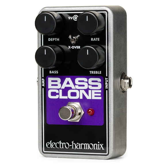 The Bass Clone chorus pedal’s core circuitry is nearly identical to the legendary Small Clone chorus, but with added features especially for bass. Chorus is a combination of modulated and dry signals. The Bass Clone’s Crossover switch cuts low end from the modulated signal so the pedal delivers a more accurately articulated bottom end with excellent note definition. The Treble control affects the whole signal while the Bass control only affects the dry half. Together with the Crossover switch they provide precise sound shaping that lets you achieve a tight, focused bass guitar sound with a well-defined low end and shimmering chorus on top.