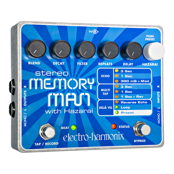 The Stereo Memory Man is a real time performance tour de force. As a Looper it has up to a full 30 seconds of loop time. World class echoes with modulation and reverse are just a few of the choices. The Stereo Memory Man with Hazarai is destined to be one of the most creative instruments you will ever own. Ethereal tone-scapes to full musical performances are only limited by your imagination. And it's all in stereo.