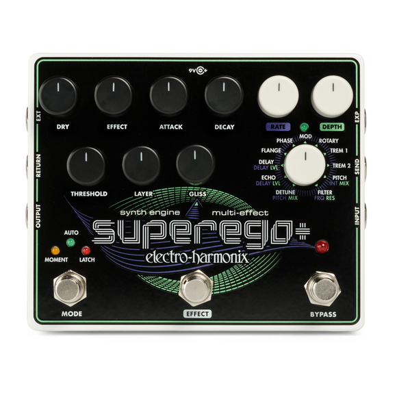 The polyphonic Superego+ works with guitar as well as other instruments including bass, keyboards, vocals, drums, etc. and comes equipped with an EHX 9.6DC-200 AC Adaptor.
