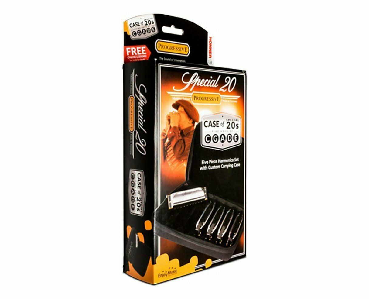 The Hohner Special Case consists of 5 Special 20 harmonicas in the most popular keys: G, A, C, D, and E. To keep the harps safe while you travel, these Hohner Special harmonicas come in a free padded case with a plush black interior that can hold a total of 7 harps.