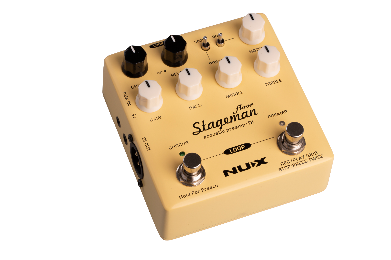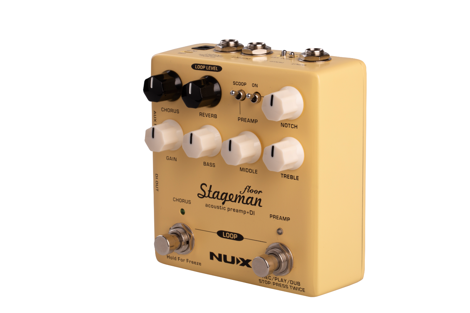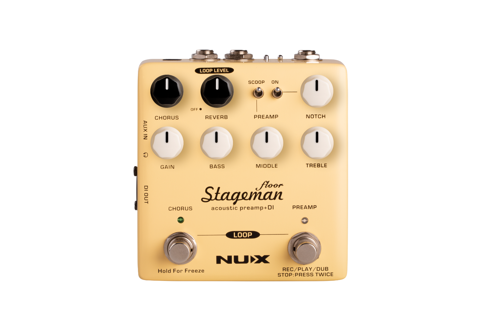 NUX Stageman Floor is an analog acoustic preamp with digital effects and looper function. Preamp featured with a highly sensitive 3-band EQ with MID scoop toggle switch, adjustable notch filter, and input gain control. And it provides a ginormous headroom which delivers the sound all natural.