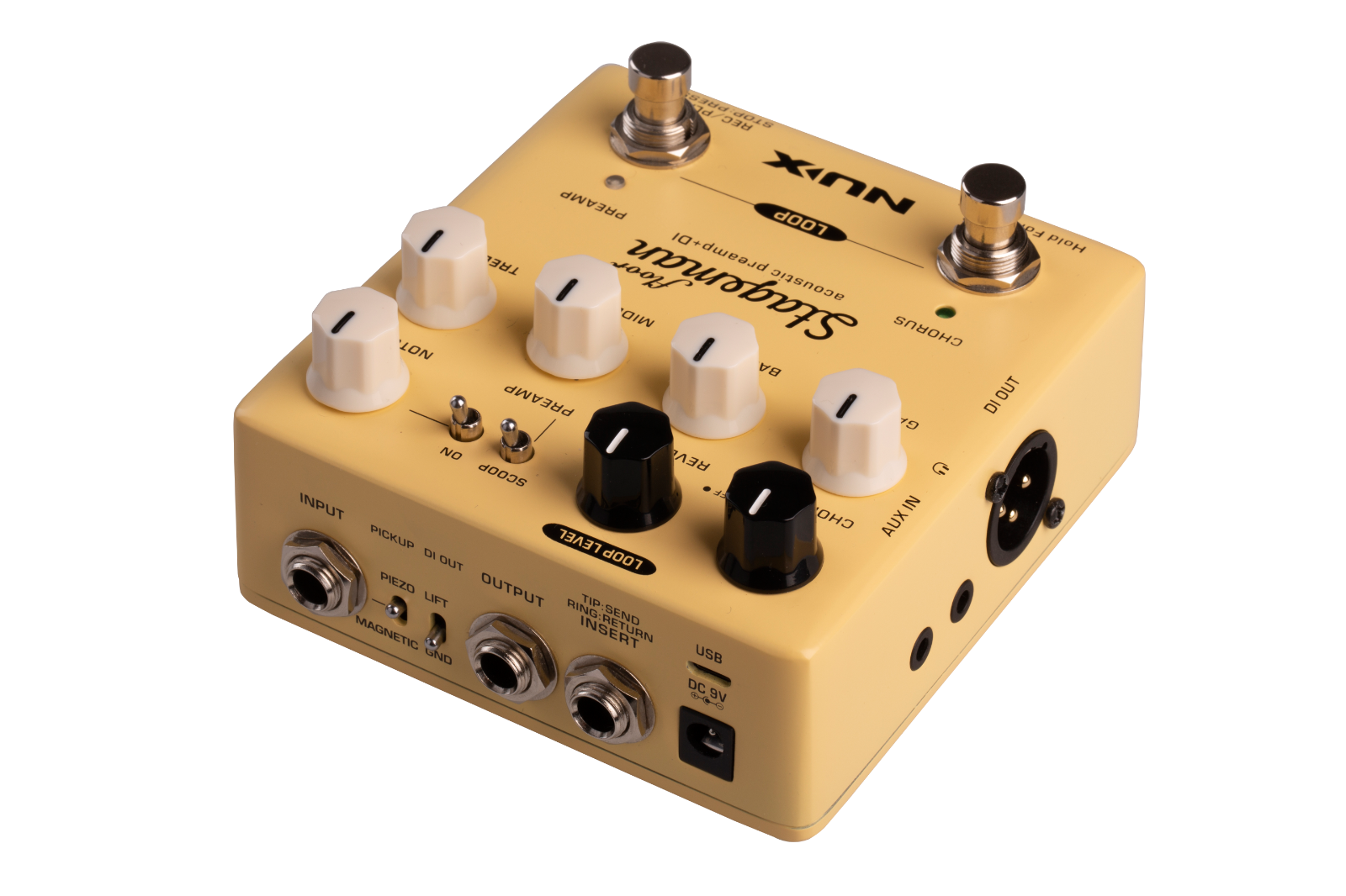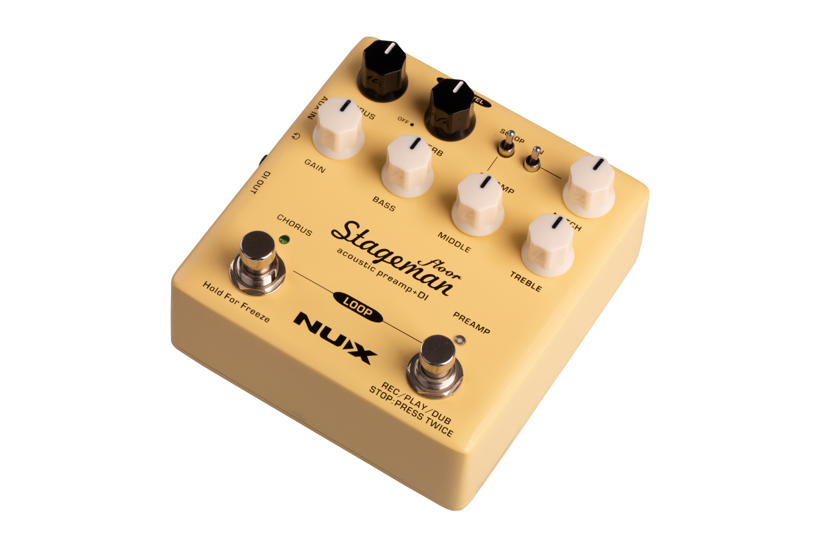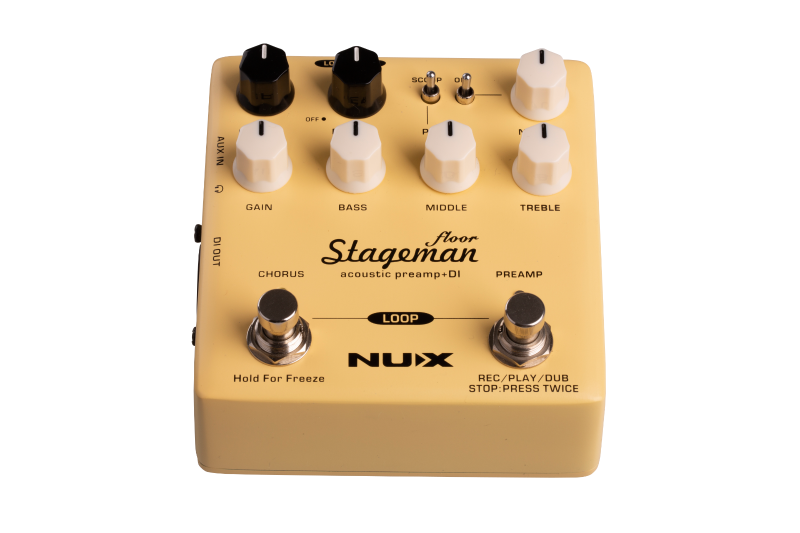 NUX Stageman Floor is an analog acoustic preamp with digital effects and looper function. Preamp featured with a highly sensitive 3-band EQ with MID scoop toggle switch, adjustable notch filter, and input gain control. And it provides a ginormous headroom which delivers the sound all natural.