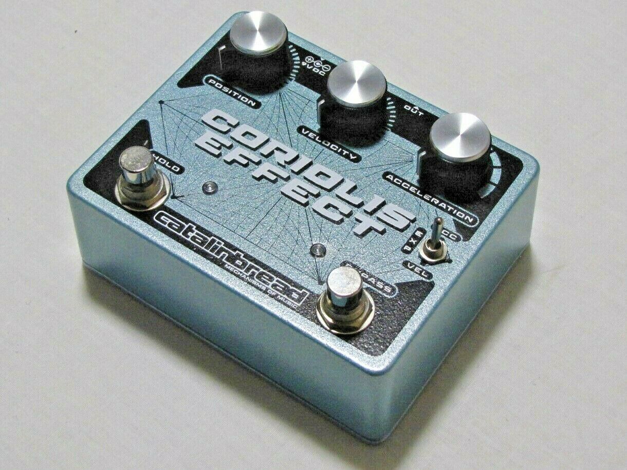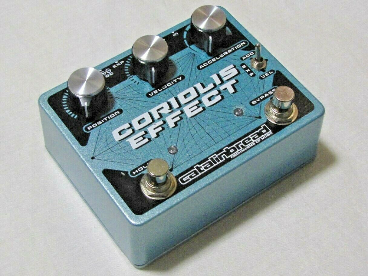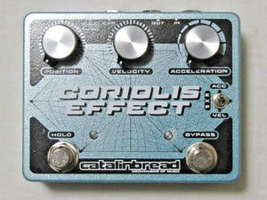The Coriolis™ Effect is a phenomenon in classical mechanics where a trajectory becomes altered due to a rotating frame of reference. The Catalinbread® Coriolis™ Effect has three main parameters to change the equations of motion for your guitar signal. Turning down the Velocity and Acceleration controls drags your playing into the heart of a black hole, redshifting your tone into a lower pitch and filtering out the high frequencies. The Hold button will instantly pull you into the black hole stopping time completely. Plug in and explore where humanity has never shredded before! In short: Think of the Coriolis™ Effect as a sustainer, wah, filter, pitch shifter, and harmonizer rolled into one—the sonic possibilities are endless!