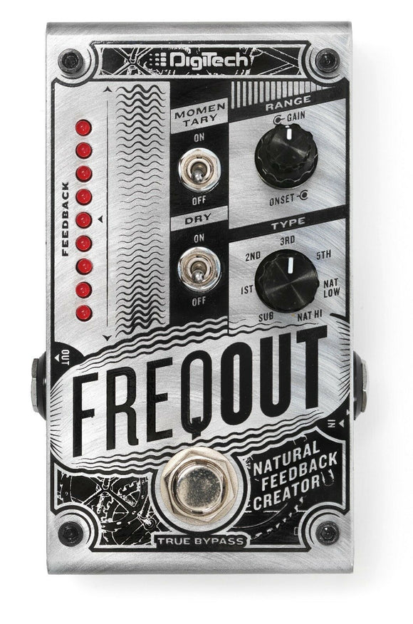 The DigiTech FreqOut Natural Feedback Creator allows you to get sweet, natural feedback at any volume, with or without distortion. The FreqOut is perfect for situations where volume must be controlled like in the studio, with in ear monitors, or low-volume performance and practice. However, the FreqOut can also be used at gig volume to focus out-of-control feedback on a preferred harmonic at any stage position.