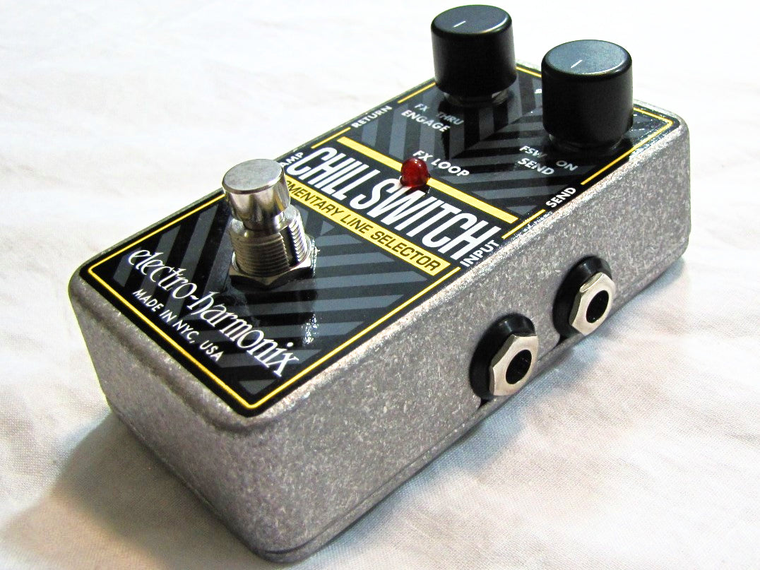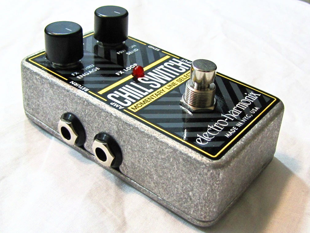 The CHILLSWITCH Momentary Line Selector is a new, utilitarian Electro-Harmonix pedal. In Kill Mode, the CHILLSWITCH can be used to provide instant muting. It can also be used to create interesting stutter effects by turning the instrument's signal abruptly on and off for hard rhythmic in/out transitions.