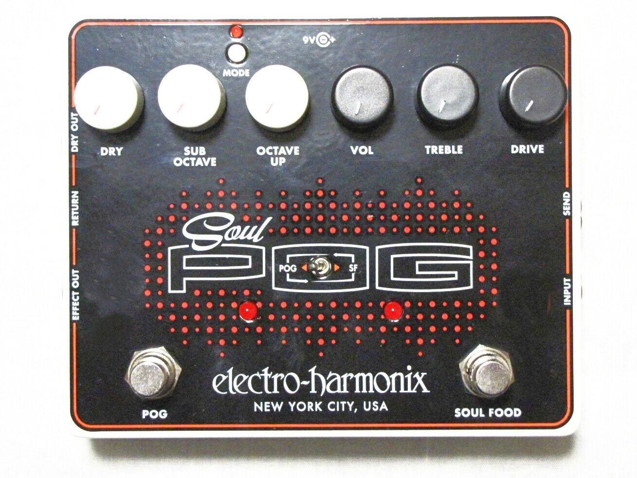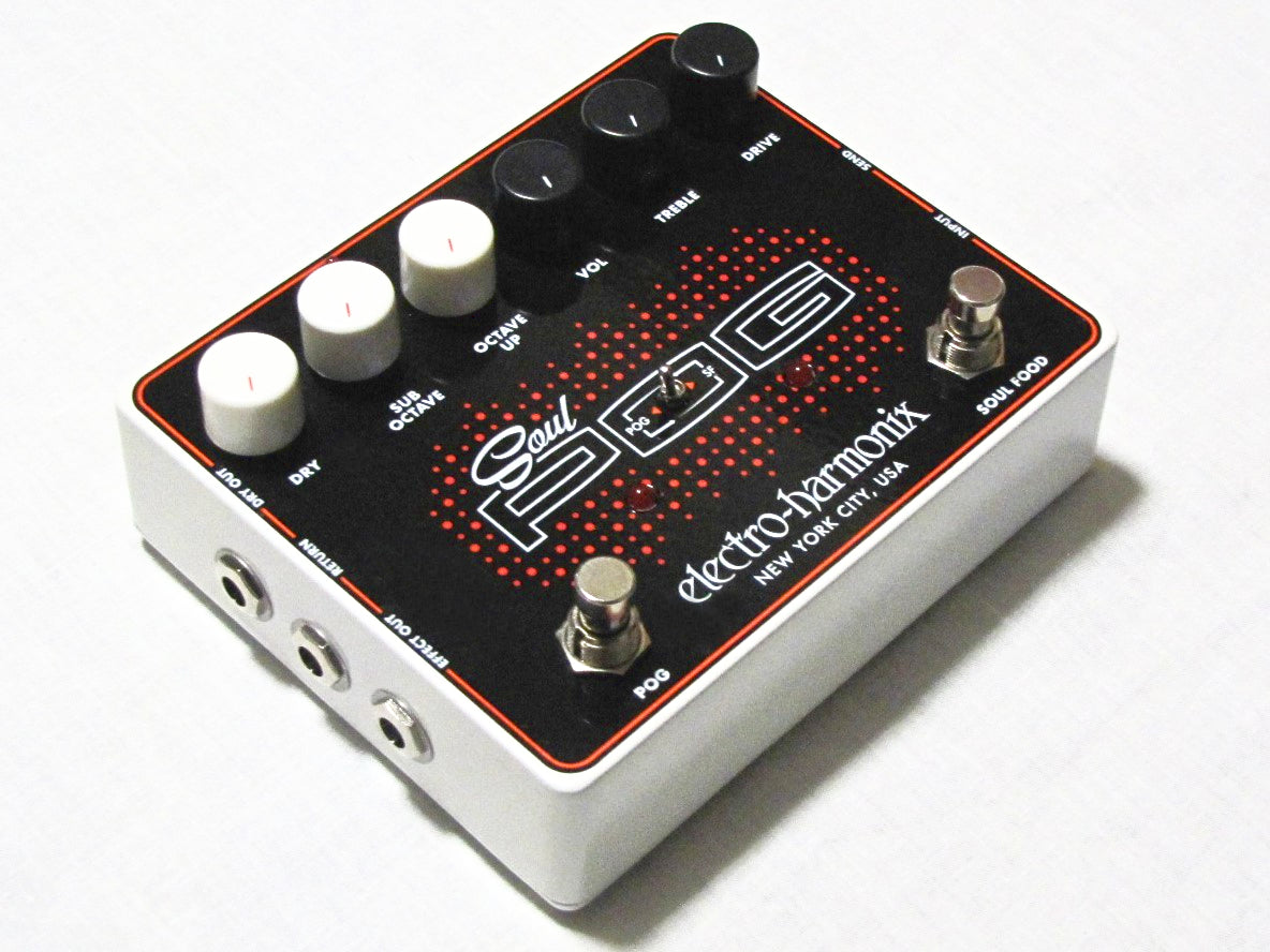Combines two sweet pedals—-the Soul Food transparent overdrive and Nano POG polyphonic octave generator—-in one potent multi-effect. Use them alone or together, put either first in the chain, insert other pedals between them with the FX loop. Also includes a cool Mode switch for a choice of two different octave-up sounds. The versatile Soul POG delivers award-winning overdrive and flawless polyphonic octaves in any combination!