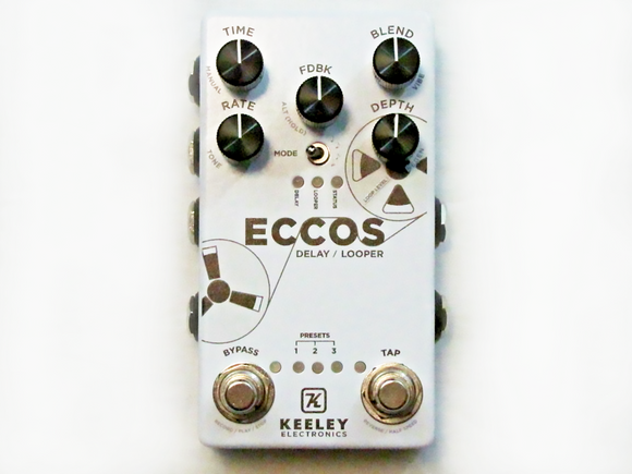 The true-stereo Keeley ECCOS artfully combines a delay pedal and a looper. At the heart of the ECCOS is a neo-vintage delay with unprecedented control over tape-style echoes. Create long and majestic sounding tape flanged delay lines and then switch to the feature-packed Looper to record endless layers of sound! Dual stomp switches in delay mode are for true-bypass, tap-tempo and even endless feedback – but in looper mode they allow you to record, play, reverse, half-speed and even trigger a “play-once”. Live or as a studio workstation the delay and looper work together giving you endless room for creating and experimenting in a small footprint. With over four years of development on the Quad 24/56-bit Dream DSP, Keeley has reached the pinnacle of delay sound quality with the amazing new tones in the ECCOS.